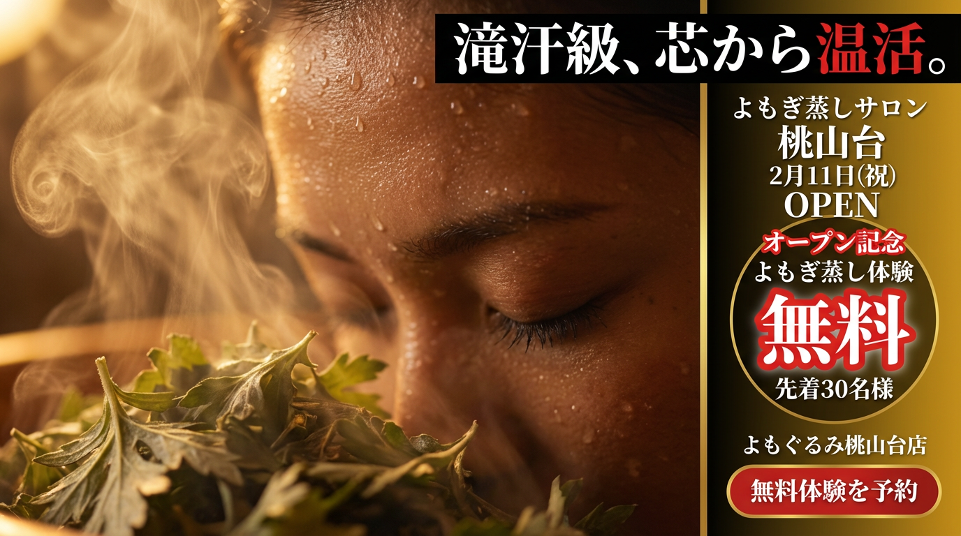 桃山台店のオープンを記念して、先着30名様に名物「地獄の滝汗ブレンド」のよもぎ蒸し体験を無料でご提供いたします。この機会にぜひ、話題のオーダーメイド調合よもぎ蒸しをご体験ください。