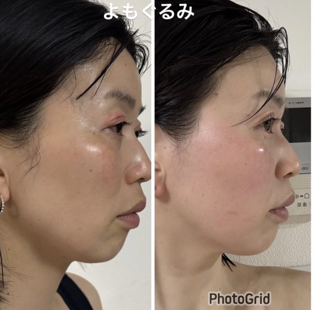 まず、まぶたの腫れや赤みが落ち着き、ヒリつきも気にならない状態へ。さらに注目すべきは、お顔全体の明るさです。くすみが抜け、透明感のある印象へと変化しているのが写真からも分かります。