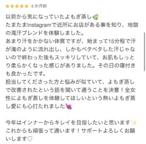 お客さまの声③ 2025 11/09 お客さまの声 2025年10月27日2025年11月9日 40代 女性 【お悩み】 くすみ・たるみ お客さまの声 お客さまの声② よもぎ蒸しはどんな体感があるの? この記事を書いた人 yomogurumi 関連記事 よもぎ蒸しをされたお客様のリアルな口コミ♪ 2026年4月21日 「自然の力で綺麗になりたい」彦根店に通われているお客様のお声 2026年4月10日 「動けないほどの生理痛が、、」彦根店に通われているお客様の口コミ 2026年4月9日 「女性としてもっと綺麗になりたい!」八日市店に通われているお客様のお声 2026年4月8日 「変化が体験できました」八日市店のお客様のリアルなお声 2026年4月6日 「身体をなんとかしたくて、、」八日市店に通われているお客様のリアルなお声 2026年4月6日 「本当にいいものって、言葉より“体感”で伝わる。」 2026年4月5日 「最近なんだか疲れが抜けない」「鏡を見るたびに老けた気がする」「何をしても変わらない」——そんなお悩みを抱えていませんか? 2026年3月22日