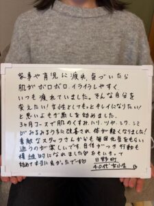 「お店の雰囲気とオーダーメイドのよもぎ蒸しが気になり、一度行ってみたいと思っていました。冷え性が悩みで以前からよもぎ蒸しに興味があり、何度かよもぐるみに通うように。回数を重ねるごとに身体が軽くなり、冷え性も以前と比べると改善してきました。一番驚いたのは、生理初日の痛みがほとんどなくなったこと。これまでは動けないほどつらかったのが、今では普段通り過ごせるようになりました。」